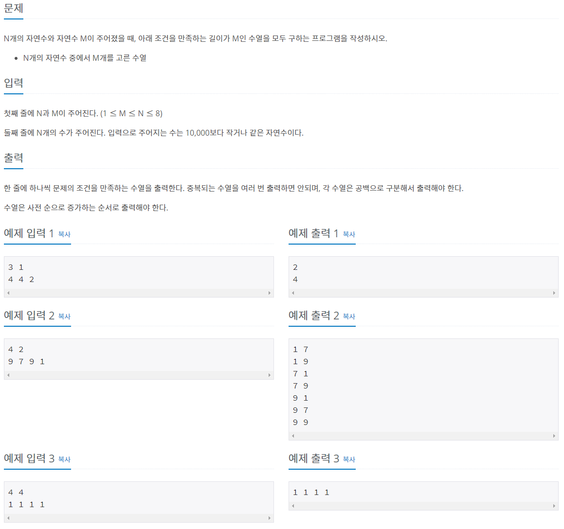 예제 입력 2에 대해 그냥 중복 상관없이 모든 수열을 사전순으로 출력하면